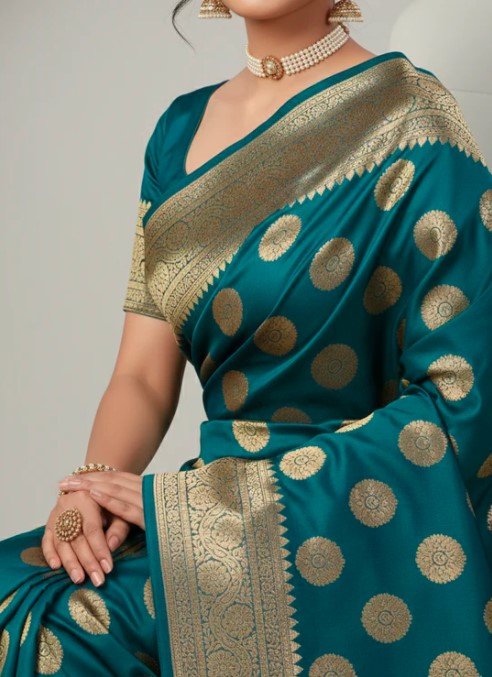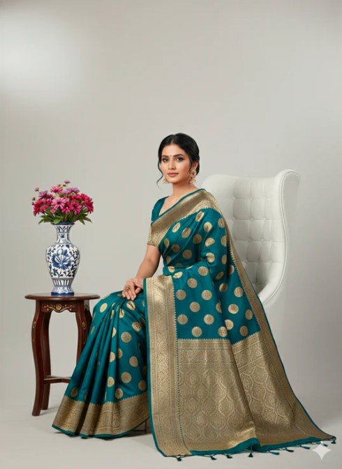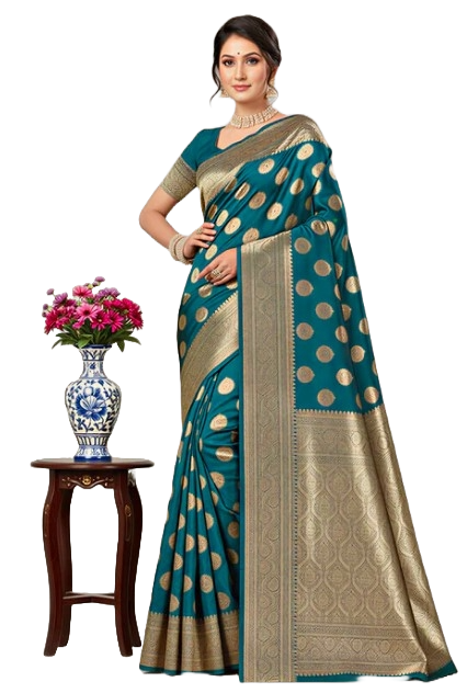 The standout feature of this saree is its meticulously detailed zari border. Designed to showcase the artistry of traditional craftsmanship, the shimmering gold and silver patterns add a touch of regal charm to the piece. Whether you’re attending weddings, engagements, or festive celebrations, the zari border enhances the rich allure of this saree, making it an elegant choice for any occasion.